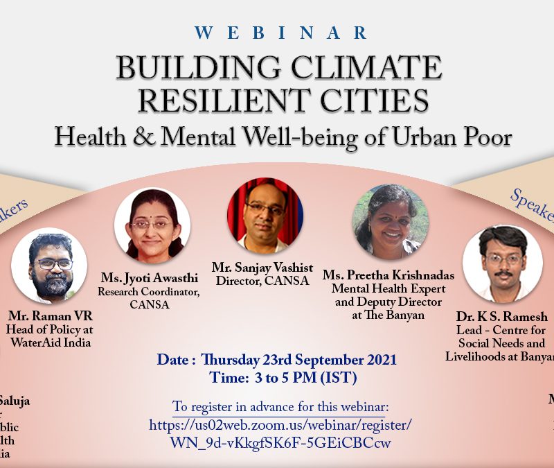 In the webinar series organised by CANSA on ‘Building Climate Resilient Cities’, the fourth and last webinar on Health & Mental well-being of Urban Poor, was conducted on 23 September 2021…