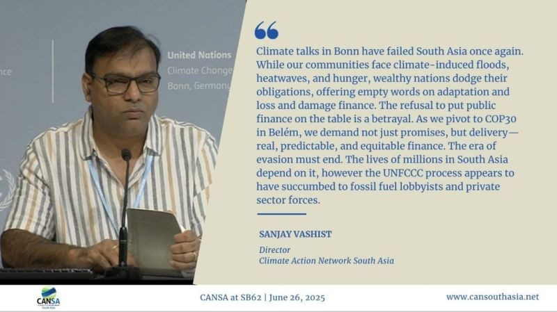 | On 26th June, the 2025 UN climate talks in Bonn concluded with limited progress, as political tensions and delayed negotiations hindered momentum on key issues like adaptation, mitigation, and climate finance — raising critical questions about whether COP30 will deliver the ambition and action the world urgently needs.CANSA’s Director, Sanjay Vashist, expressed his disappointment at the conclusion: “Climate talks in Bonn have failed South Asia once again. While our communities face climate-induced floods, heatwaves, and hunger, wealthy nations dodge their obligations, offering empty words on adaptation and loss and damage finance. ….” |