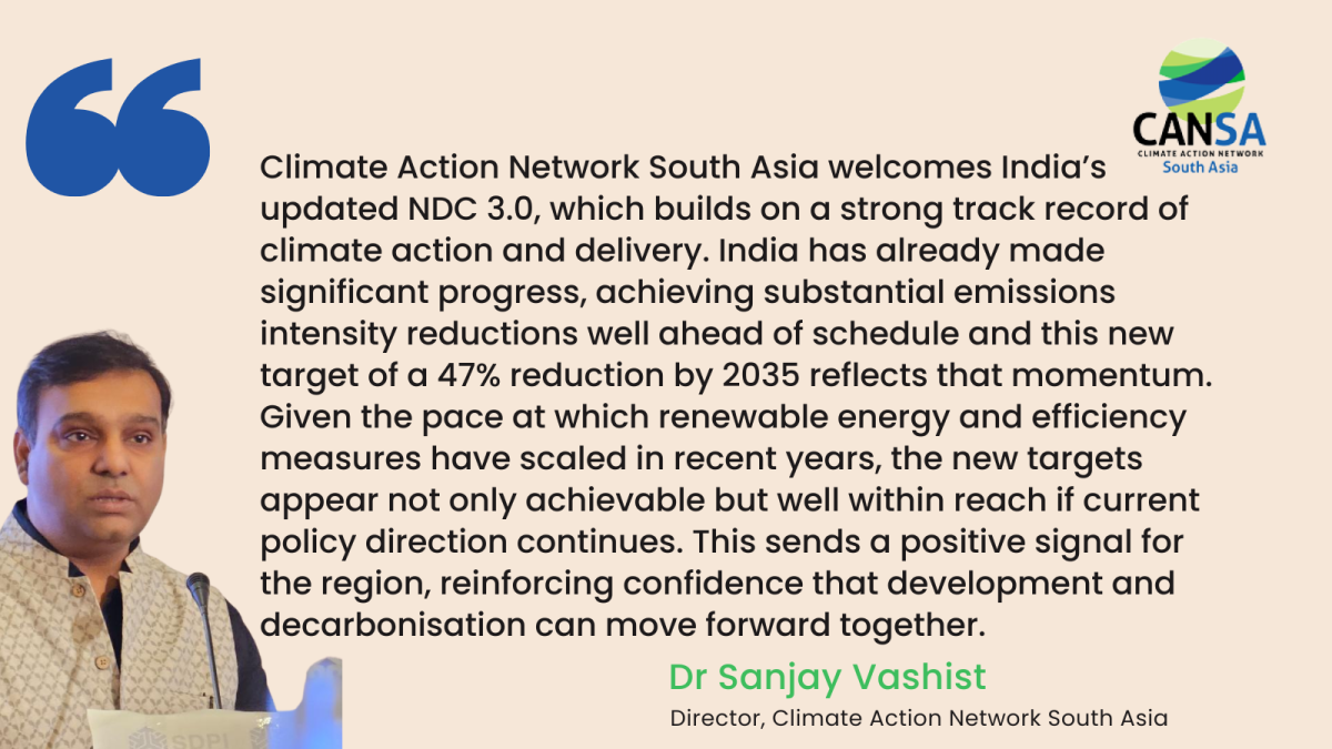 Climate Action Network South Asia (CANSA) welcomes India’s updated NDC 3.0 as a strong signal that climate ambition and development can advance together. At a time of global uncertainty, India’s continued leadership — backed by overachievement of earlier targets and enhanced commitments on emissions, clean energy, and carbon sinks — builds regional confidence. For South Asia, it reinforces a vital message: a just, low-carbon future is both necessary and achievable.
