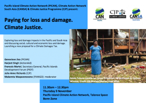 Climate Action Network Pacific Islands, Climate Action Network South Asia and Climate Justice Programme will explore loss and damage impacts in the Pacific and South Asia and discuss social, cultural and economic loss and damage alongside the politics of loss and damage by launching our new proposal for a Climate Damages Tax at the UNFCCC 23rd Conference of Parties.