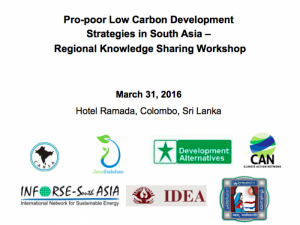 CAN South Asia with members and partners such as Janathakshan, IDEA, Development Alternatives, AIWC and INFORSE South Asia started advocacy for pro-poor low carbon development strategies as a concerted effort in 2014 for upcoming opportunities to influence national and international policies such as UN SDGs, INDCs, COP21 Paris Agreement. The 2 years of experience will be shared and discussed amongst project members and partners to consolidate the learning for future work required in South Asia. The considerable scope for regional cooperation is still largely unutilized which is also part of the workshop agenda.