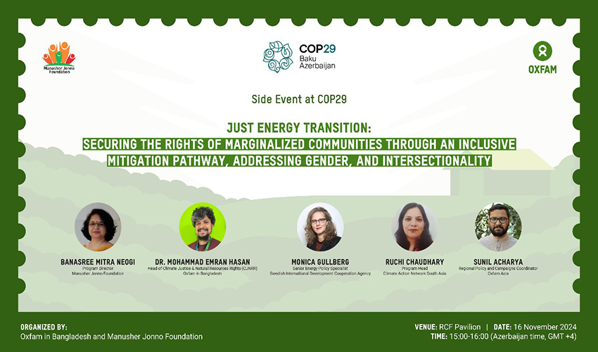 The panellists included Sunil Acharya, Regional Policy and Campaigns Coordinator, Oxfam Asia, Dr. Mohammad Emran Hasan, Head of Climate Justice & Natural Resources Rights, Banasree Mitra Neogi, Program Director, Manusher Jonno Foundation, Ruchi Chaudhary, Program Manager, Climate Action Network South Asia, Monica Gullberg, Senior Energy Policy Specialist, Swedish International Development Cooperation Agency (SIDA).